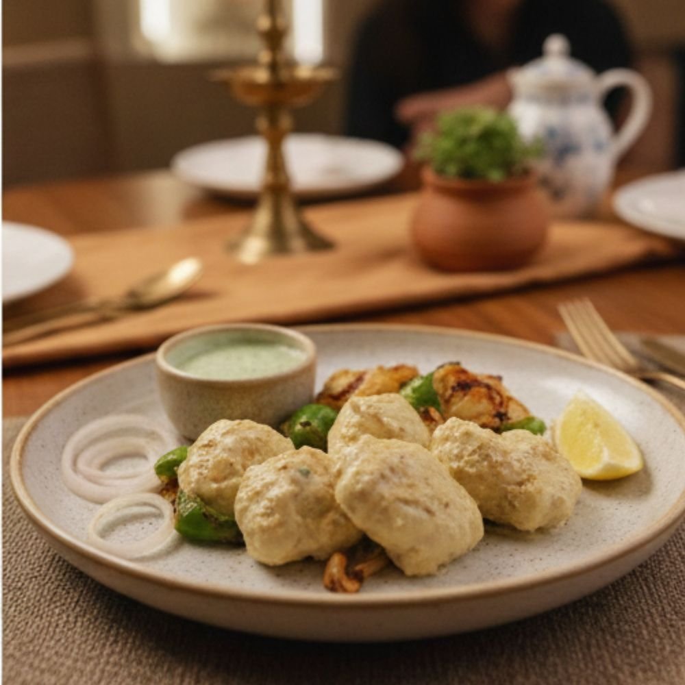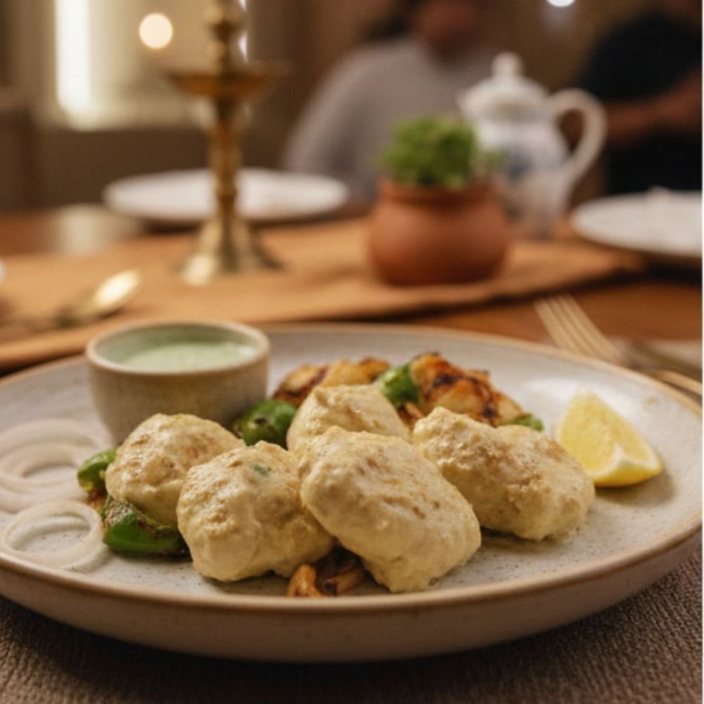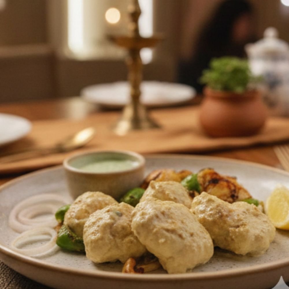 Grilled until lightly charred, Afghani Chaap is served hot with mint chutney, sliced onions, and lemon wedges—perfect for those who enjoy mild, creamy starters.