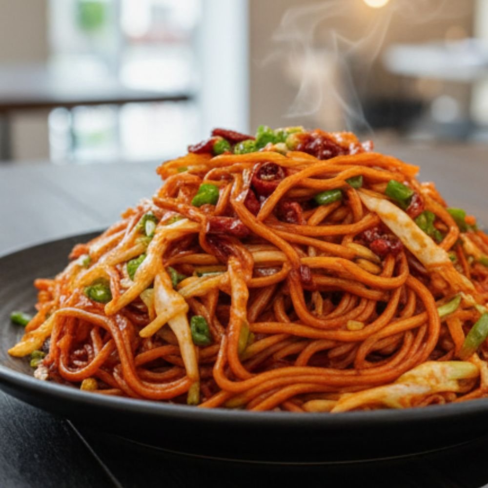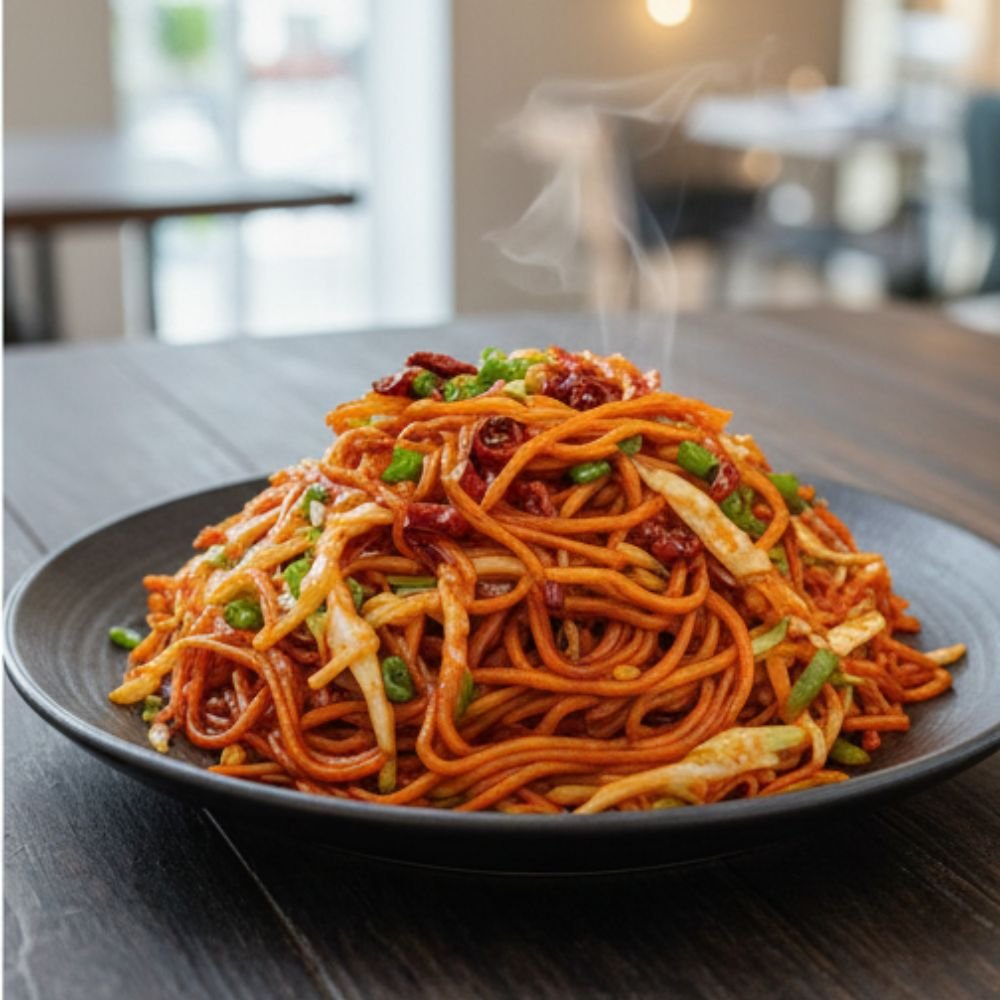 Schezwan Noodles is a spicy Indo-Chinese dish made with stir-fried noodles tossed in bold Schezwan sauce, garlic, and fresh vegetables. Fiery, aromatic, and flavour-packed, it’s ideal for lovers of strong, spicy flavours.